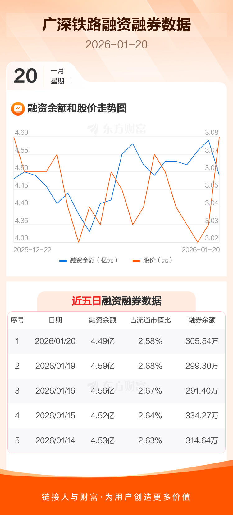 交易所最新数据显示,广深铁路于2026年1月20日获融资买入1543.80万元,融资偿还2500.63万元,当日融资净偿还956.83万元。目前,该股融资余额4.49亿,占流通市值比例为2.58%。