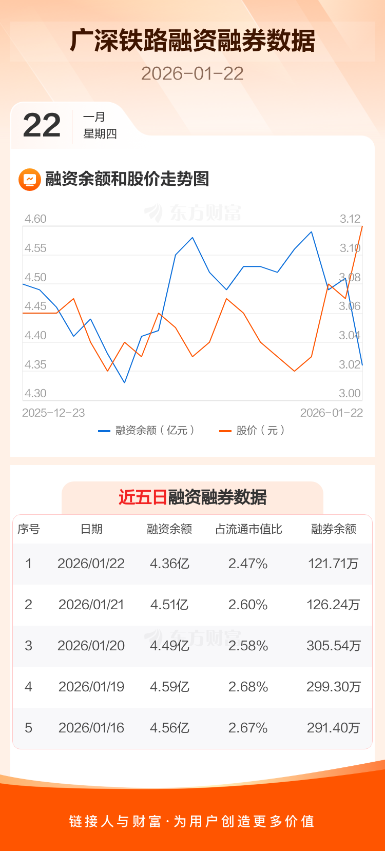 交易所最新数据显示,广深铁路于2026年1月22日获融资买入1799.18万元,融资偿还3280.39万元,当日融资净偿还1481.21万元。目前,该股融资余额4.36亿,占流通市值比例为2.47%。