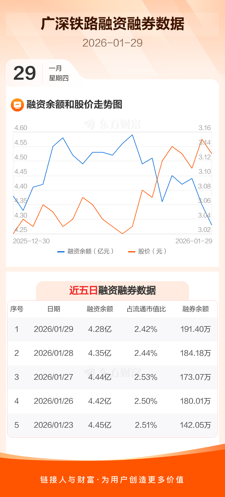 交易所最新数据显示,广深铁路于2026年1月29日获融资买入1469.13万元,融资偿还2086.08万元,当日融资净偿还616.95万元。目前,该股融资余额4.28亿,占流通市值比例为2.42%。