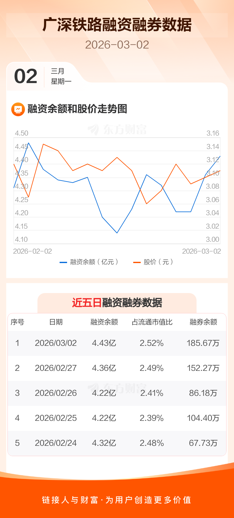 交易所最新数据显示,广深铁路于2026年3月2日获融资买入3097.64万元,融资偿还2371.69万元,当日融资净买入725.95万元。目前,该股融资余额4.43亿,占流通市值比例为2.52%。
