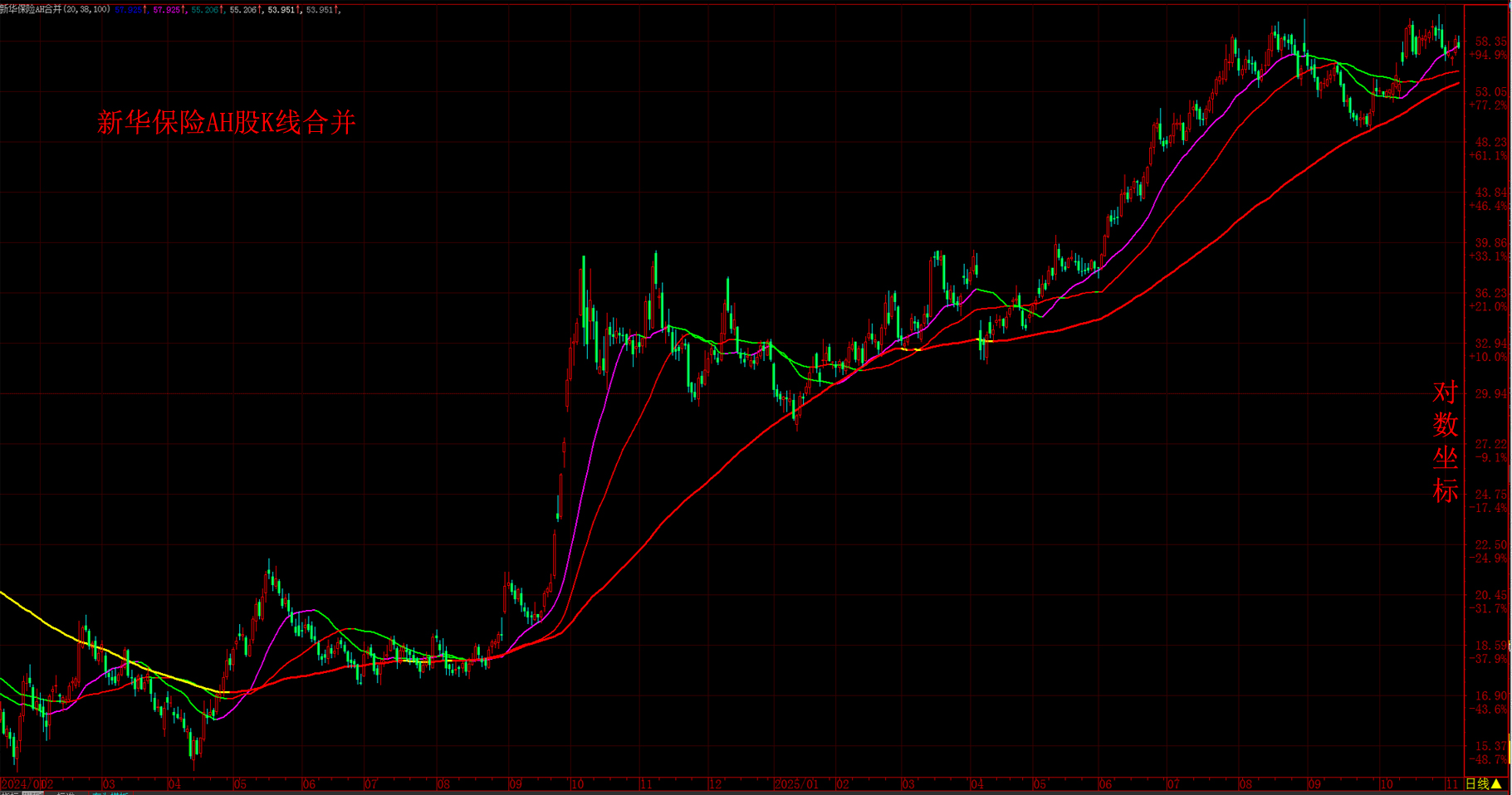 新华保险AH股K线合并图2025.11.9.