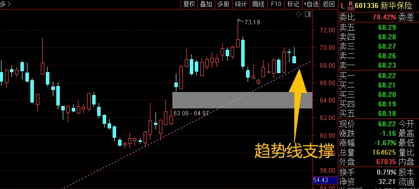 $新华保险(SH601336)$ 新高,中期看好,剩下无非就是短期节奏罢了。近期震荡中,强一些就看脚底趋势线的支撑情况,能稳住就很强,但如果稳不住弱一些,就主要看脚底安全线65.42附近的支撑了,一般来说问题不大,先观察着吧。