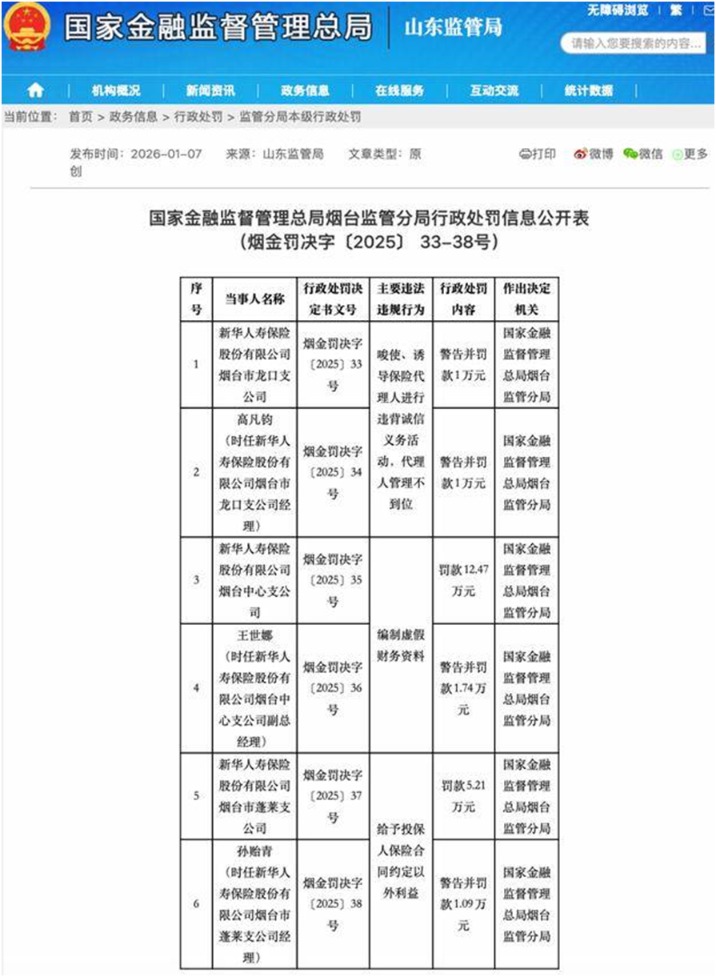 无独有偶,广东地区的分支机构也同期被罚。公开信息报道,2026年2月中旬,广东金融监管局发布行政处罚信息,新华保险东莞中心支公司、佛山中心支公司因“虚列银保专管员佣金”违规,分别被罚款25万元、16万元,相关责任人谢足玲、伍钧也被给予警告并合计罚款3万元。