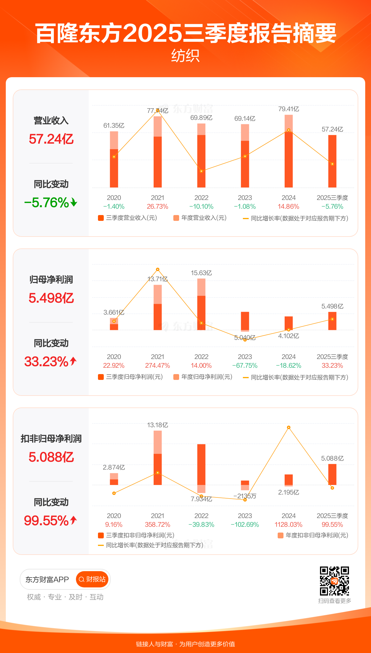 百隆东方10月31日发布2025年三季报显示,公司前三季实现营业收入57.24亿元,同比下滑5.76%;归母净利润5.50亿元,同比增长33.23%;扣非归母净利润5.09亿元,同比增长99.55%。