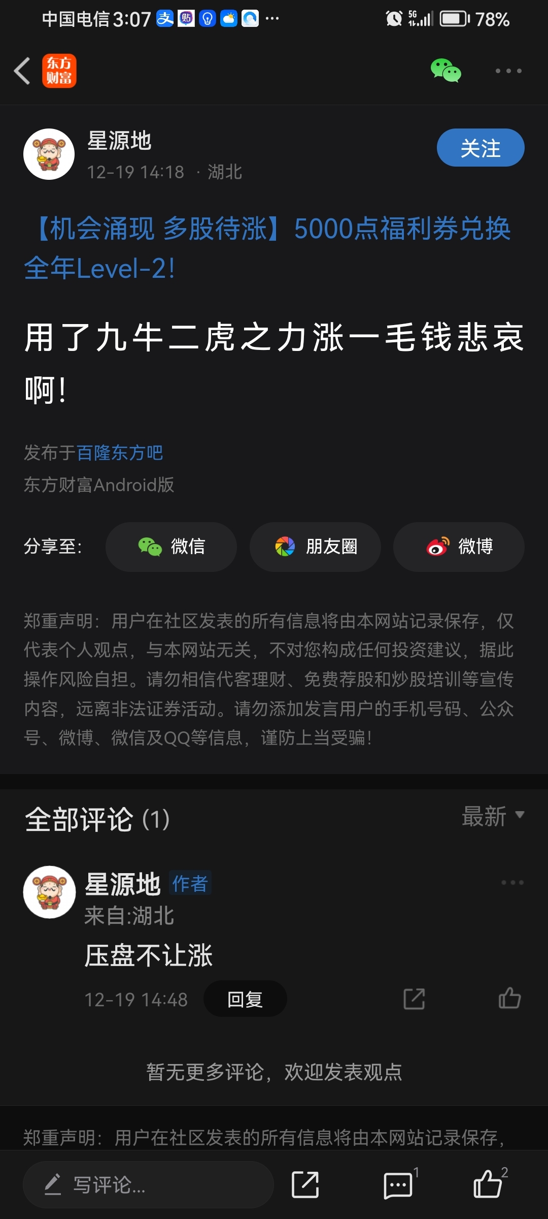 温馨提示: 1.根据《证券法》规定,禁止编造、传播虚假信息或者误导性信息,扰乱证券市场;2.用户在本社区发表的所有资料、言论等仅代表个人观点,与本网站立场无关,不对您构成任何投资建议。用户应基于自己的独立判断,自行决定证券投资并承担相应风险。《东方财富社区管理规定》