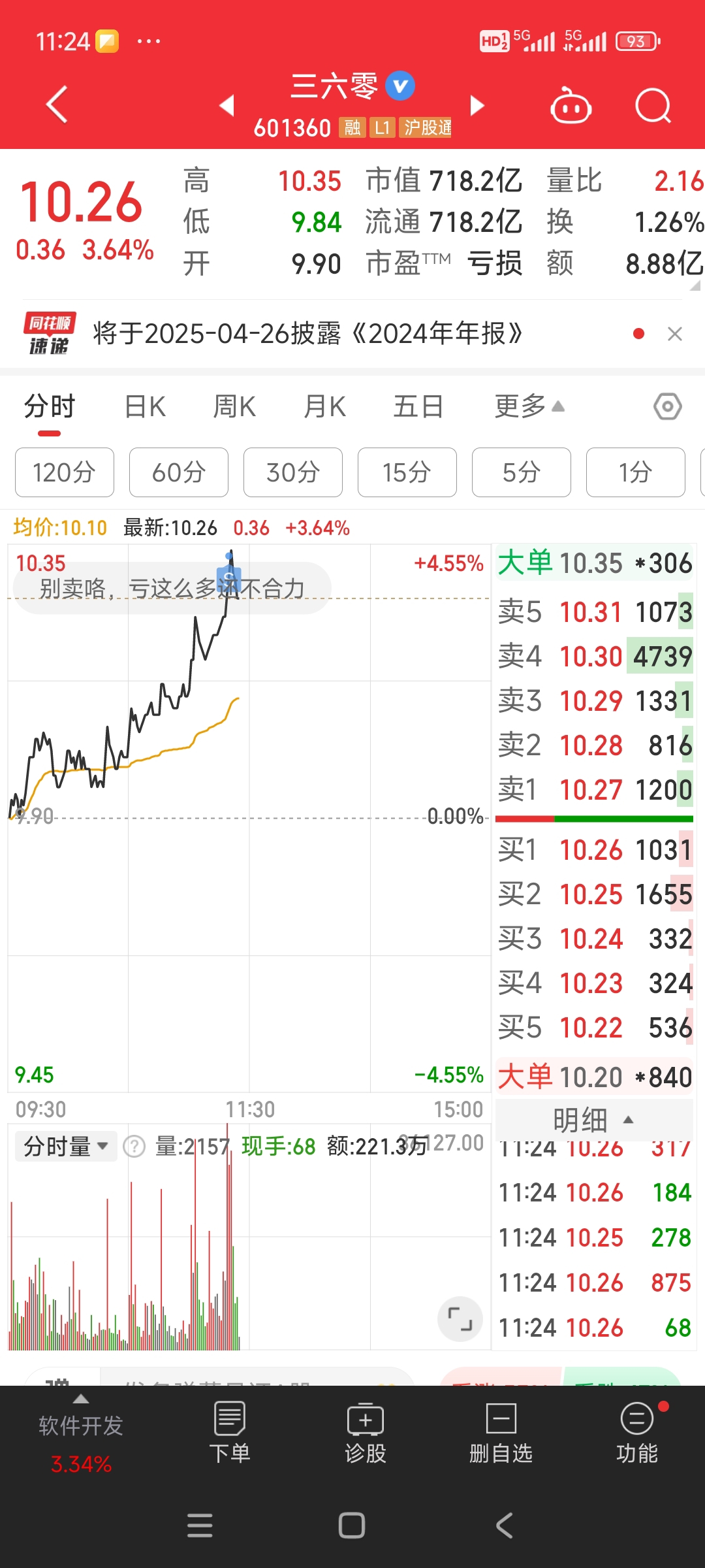 $三六零(SH601360)$ 10.13的本,10.33抛了,赚个1000元,不容易,到10再买