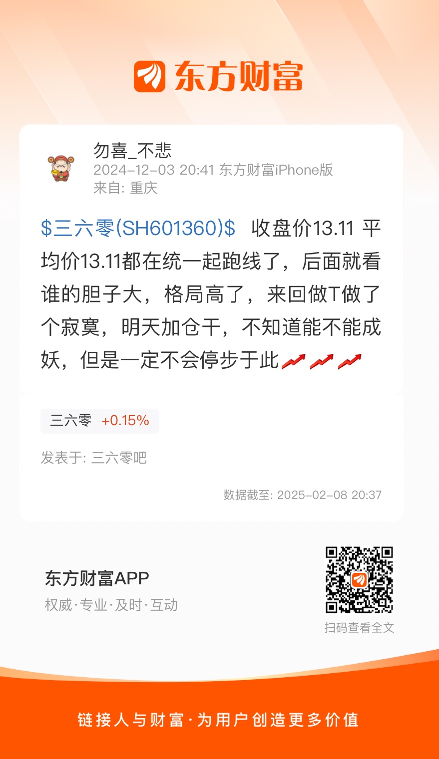 $三六零(SH601360)$ 收盘价13.11 平均价13.11都在统一起跑线了,后面就看谁的胆子大,格局高了,来回做T做了个寂寞,明天加仓干,不知道能不能成妖,但是一定不会停步于此