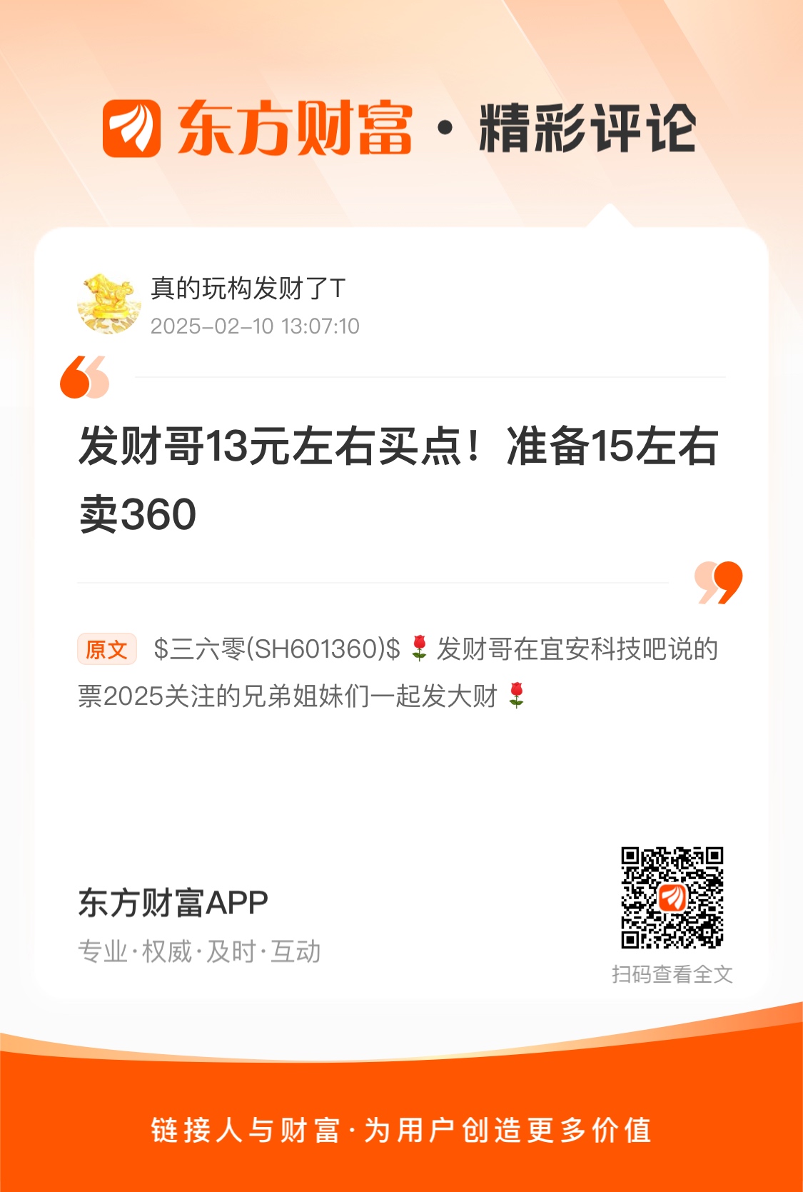 $三六零(SH601360)$  发财哥在宜安科技吧说的票2025关注的兄弟姐妹们一起发大财
