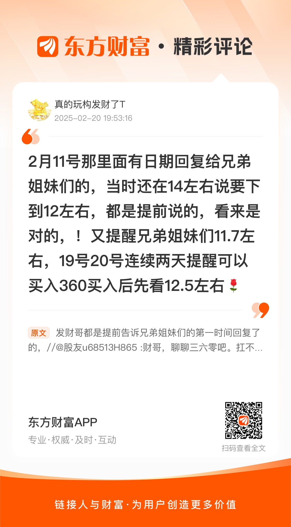 //@真的玩构发财了T : 2月11号那里面有日期回复给兄弟姐妹们的,当时还在14左右说要下到12左右,都是提前说的,看来是对的,!又提醒兄弟姐妹们11.7左右,19号20号连续两天提醒可以买入360买入后先看12.5左右
