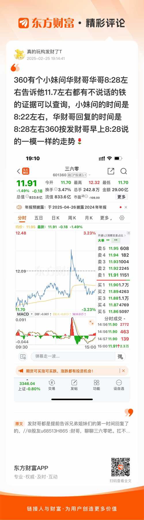 又对了,//@真的玩构发财了T : 360有个小妹问华财哥华哥8:28左右告诉他11.7左右都有不说话的铁的证据可以查询,小妹问的时间是8:22左右,华财哥回复的时间是8:28左右360按发财哥早上8:28说的一模一样的走势