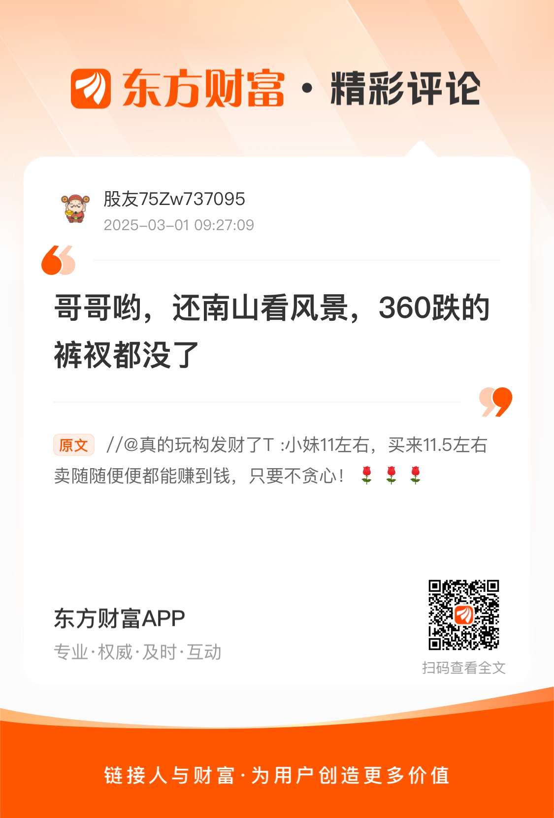 兄弟按着发财哥的操作多操作几次都赚钱了,是不是提前两天说的又对//@股友75Zw737095 : 哥哥哟,还南山看风景,360跌的裤衩都没了