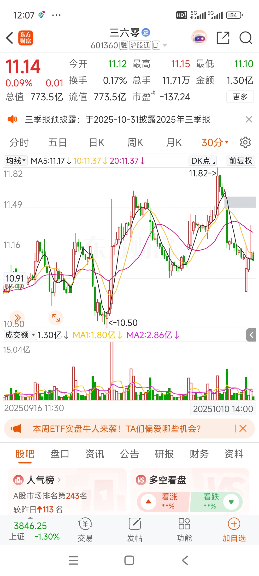 $三六零(SH601360)$ 估计10.8调整到位了,夲想10.5抄底,没有抄到。下午看10.91会不会到。这两天多看少动。如果到10.5就买。