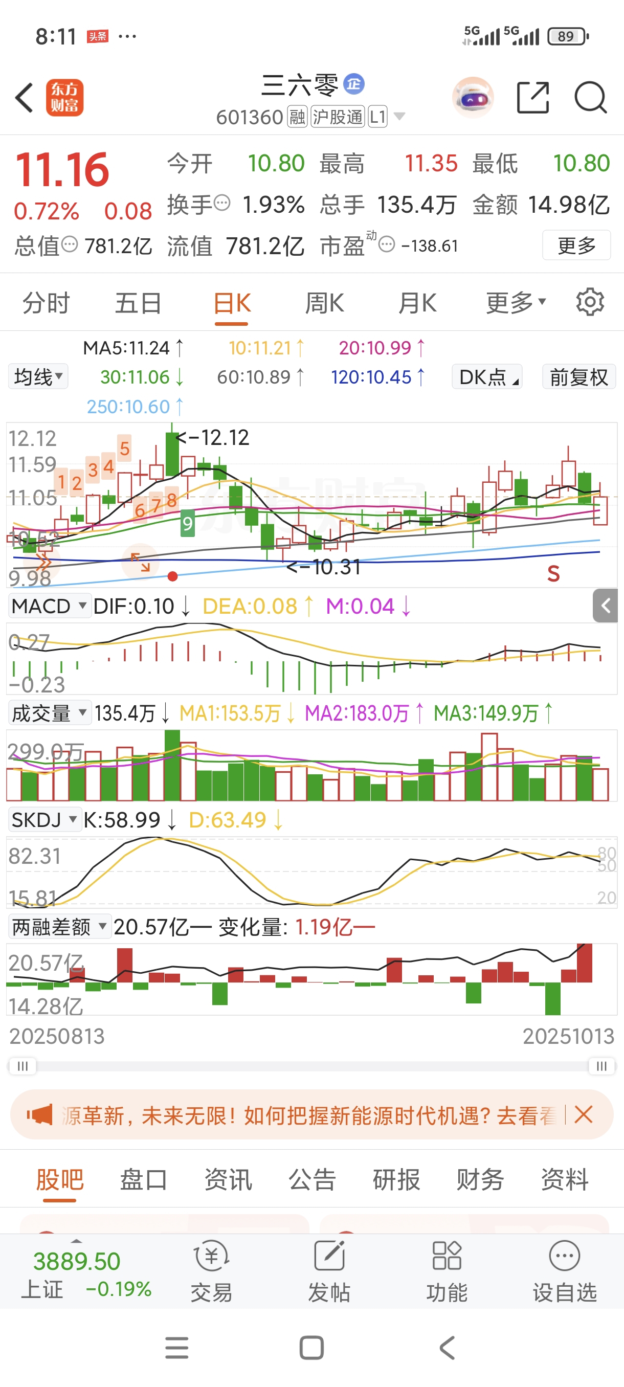 $三六零(SH601360)$ 没有上五日线,明天大概率冲高回落