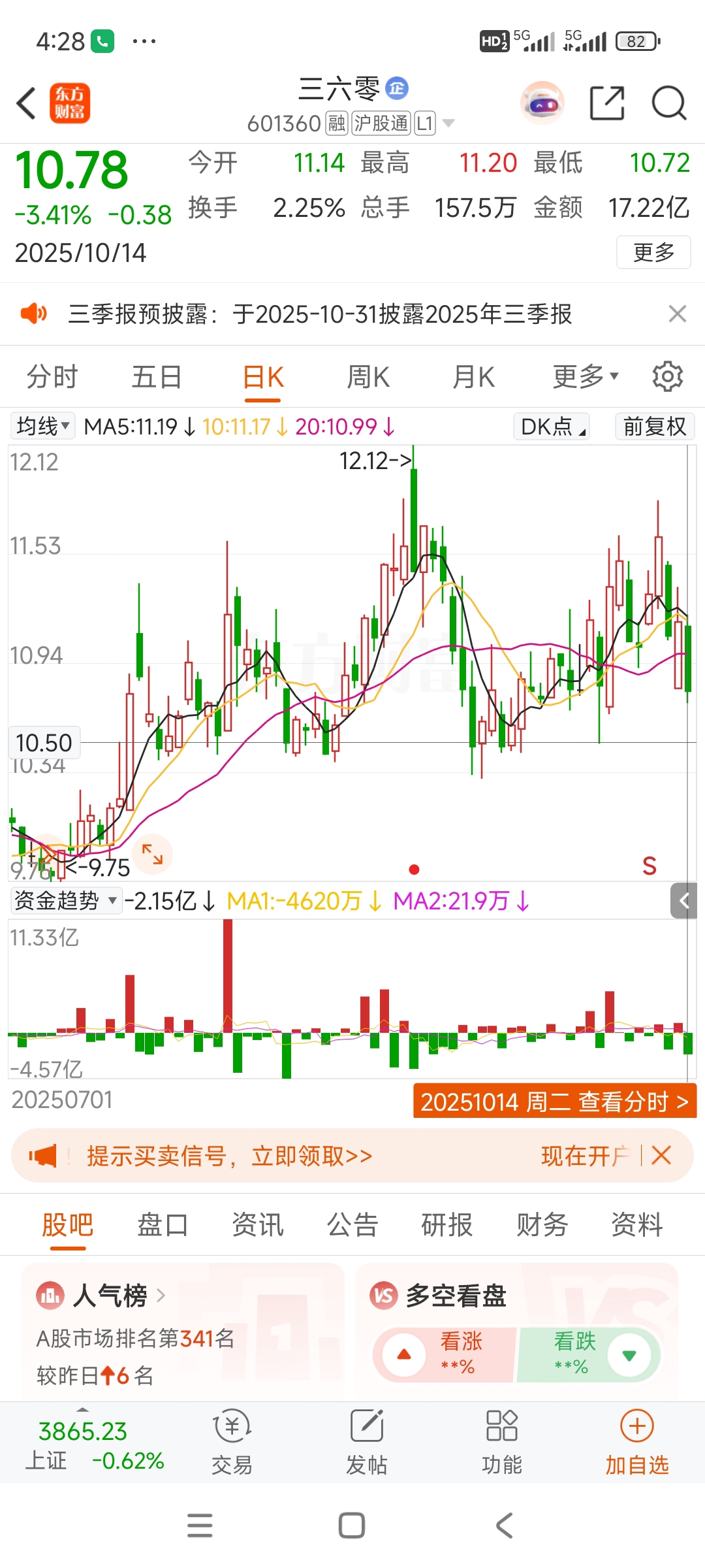 $三六零(SH601360)$ 明天估计跌到10.5差不多了,大家考虑买点