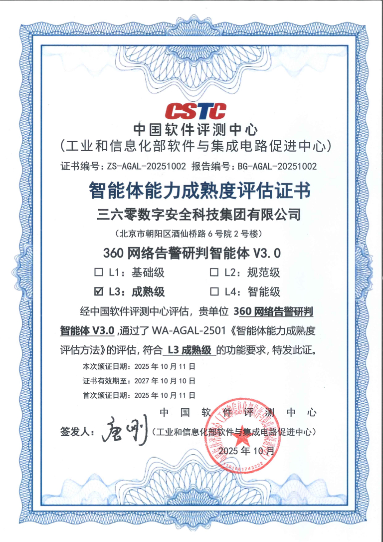 $三六零(SH601360)$ 近日,360安全智能体首家通过中国软件评测中心智能体能力成熟度评估,在“钓鱼邮件研判”和“网络告警研判”两大核心场景中,双双获评L3成熟级认证,这不仅彰显了360在智能体技术应用上的领先实力,也标志着其在企业安全运营与产业智能化转型中,稳居行业第一梯队。