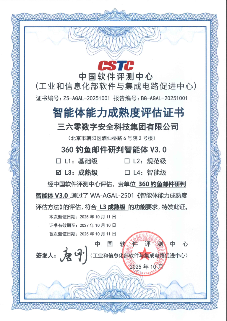 近日,360安全智能体首家通过中国软件评测中心智能体能力成熟度评估,在“钓鱼邮件