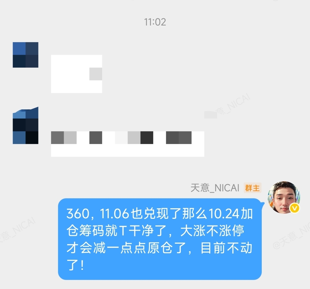 $三六零(SH601360)$ 360,11.06也兑现了那么10.24加仓筹码就T干净了,大涨不涨停才会减一点点原仓了,目前不动了!