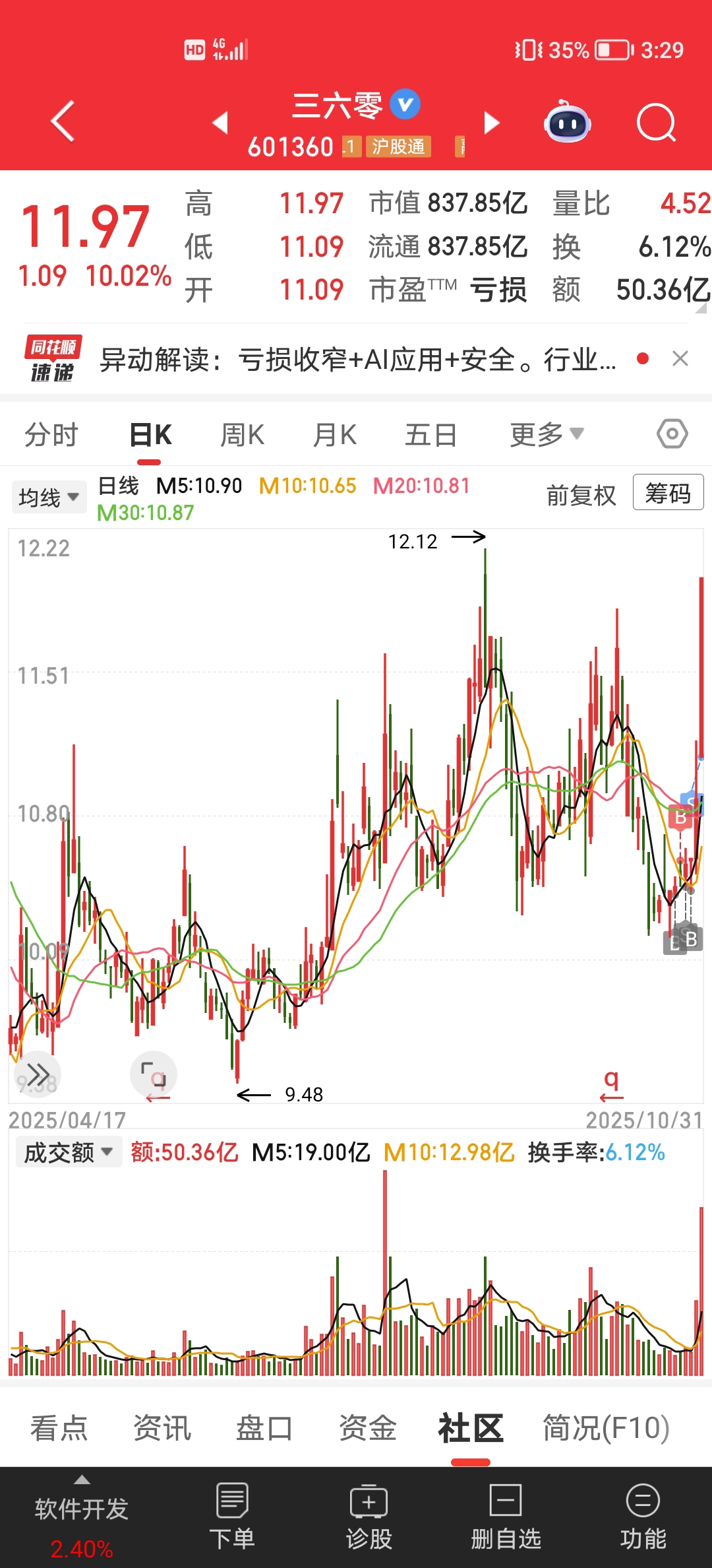 $三六零(SH601360)$ 感谢主力拉升,这周没有辜负我的加仓,虽然只赚了几百块钱,也知足了。