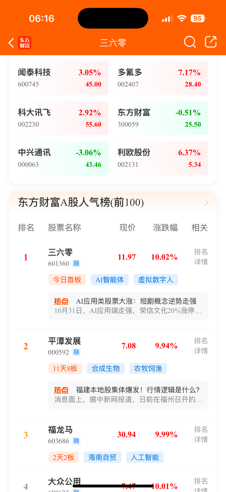 $三六零(SH601360)$ 360才一个涨停干到第一名?难道360开始起飞了?