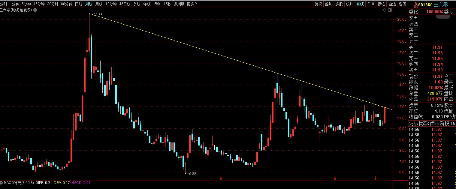 三六零,周线下降通道要突破了!周五爆量拉涨停板,显示主力做多的意愿,下周突破八月