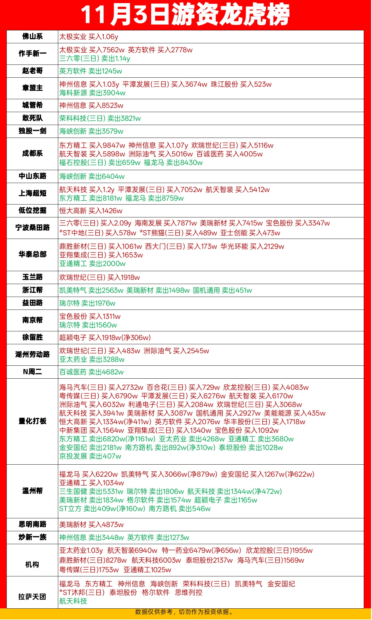11.3游资龙虎榜,作手新一章盟主佛山系上榜。