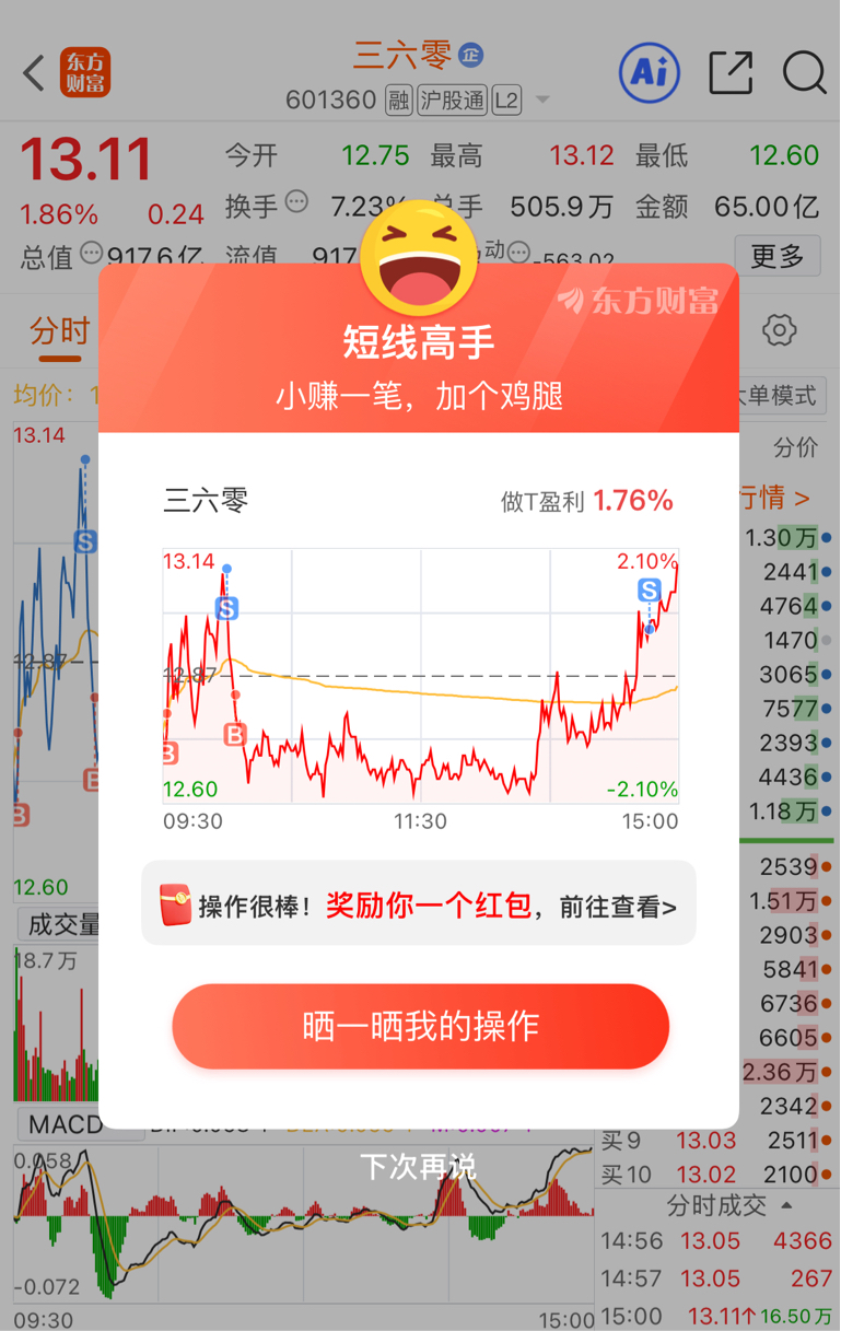 $三六零(SH601360)$ 咦,定好的价格自动卖出了,尴尬,晚点卖还能t更多一点,不过明天大概率会跌的,所以今天这点利润也只是看看而已。