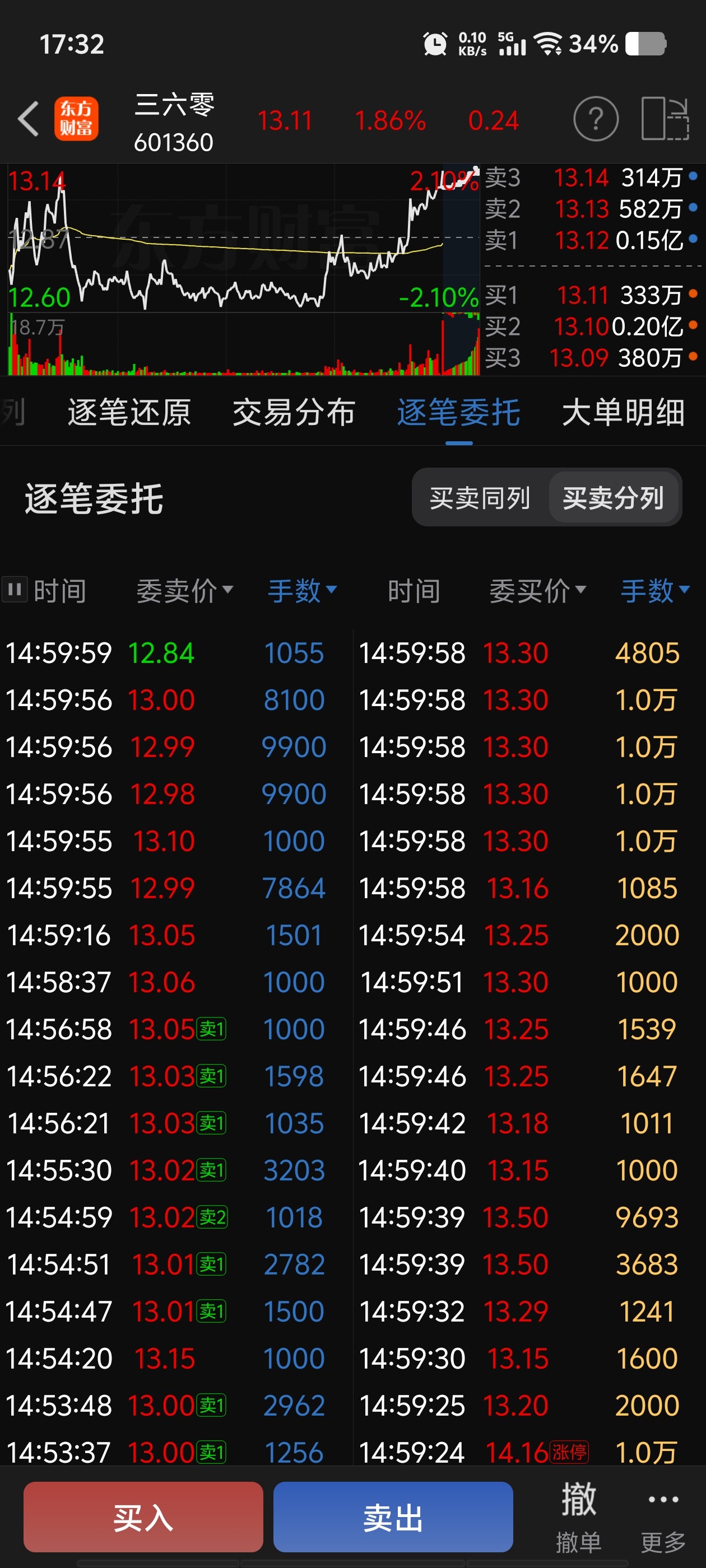 $三六零(SH601360)$ 集合竞价1.2亿大单抢筹