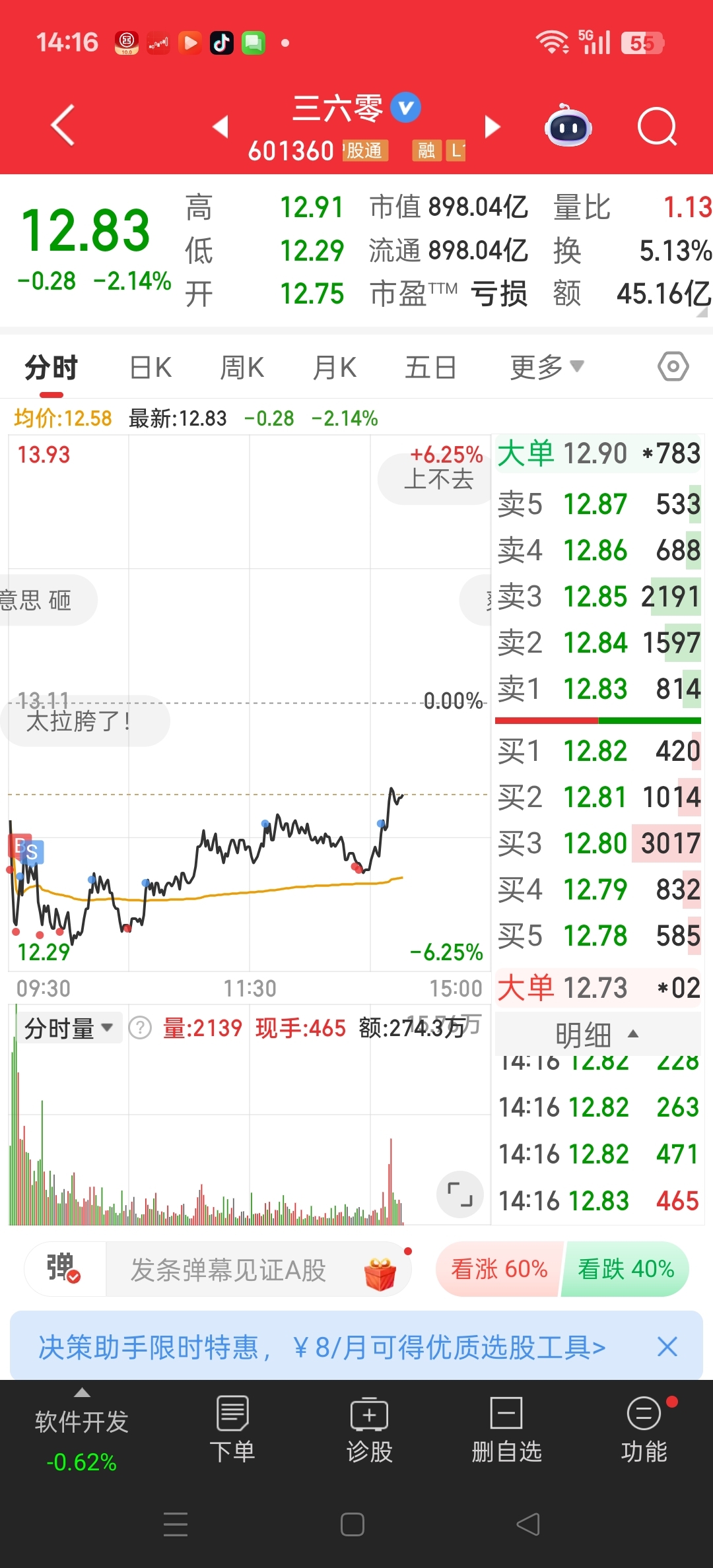 $三六零(SH601360)$ 不应该做t,应该加仓的,小丑了。