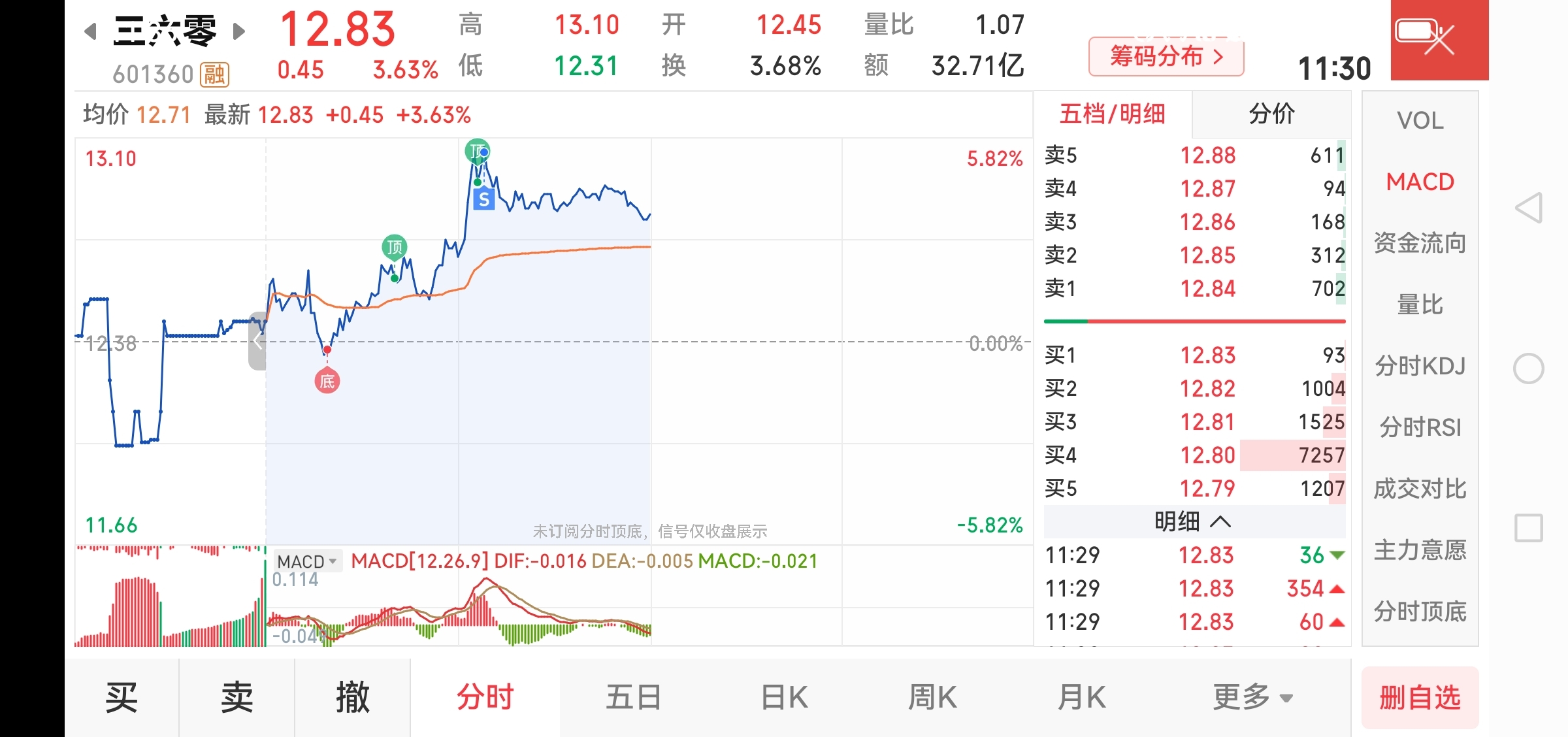 三六零午盘收盘点评:周五预测收盘价12.6,是因为收到此处,就预示着超短线分时要大涨。主力在今天早上10.30分时,只要还是收到大致的位置,就收出了60分钟k线上的一阳包三阴,就可持股等待它继续大冲。