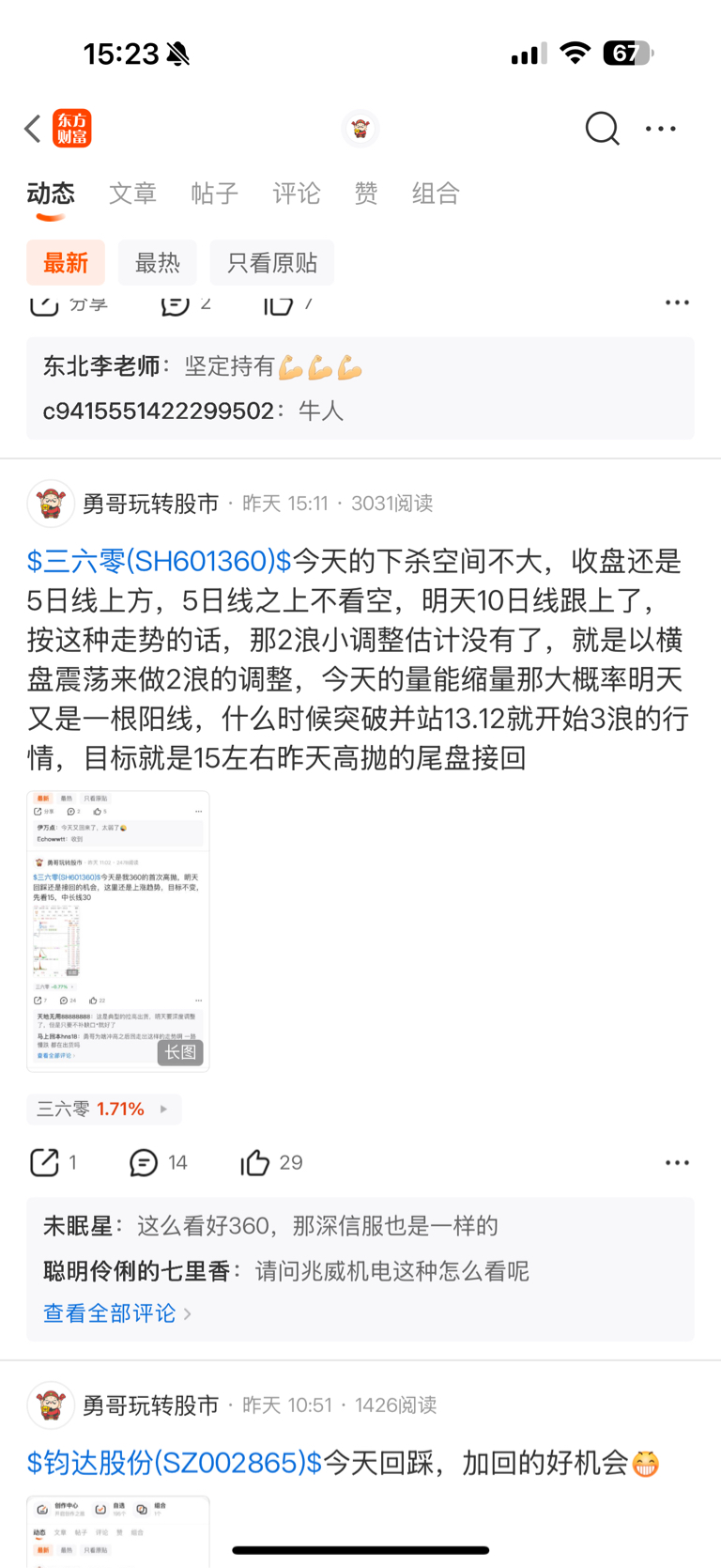 $三六零(SH601360)$ 今天继续走的横盘震荡一天,分时波段比较大,看盘的是拿不住股票的,继续洗掉不坚定的筹码,今天收盘成功站上13.12主力高度控盘,缺口已经8天没有回补,那就不会回补了,明天看涨,随时拉升拉升行情 本月15是很有希望的