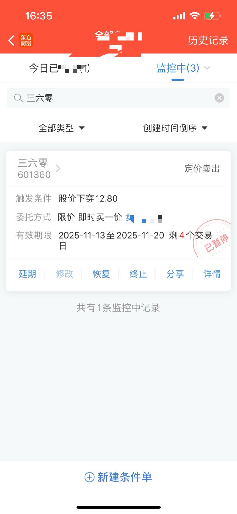 $三六零(SH601360)$ 昨天设置的条件单手贱给暂停了.....
