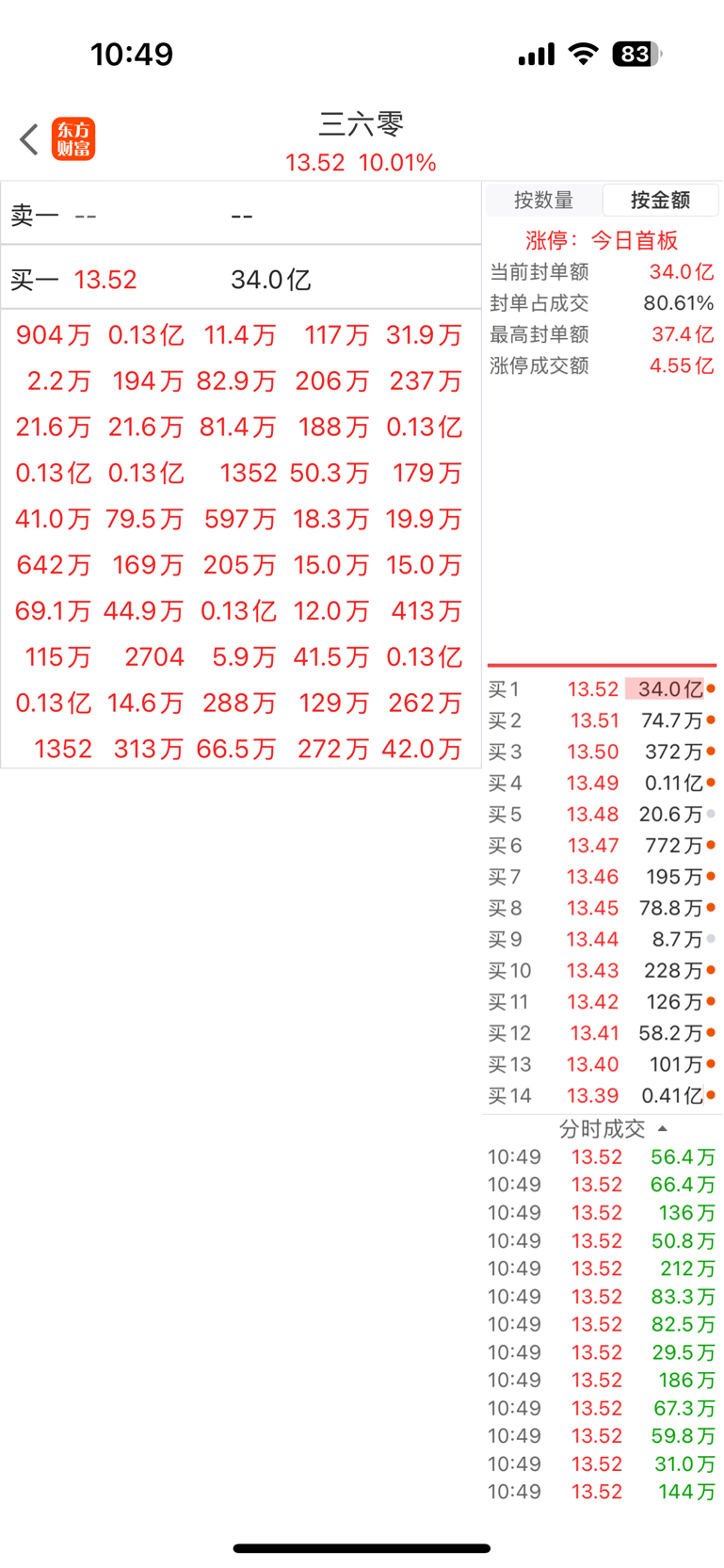 $三六零(SH601360)$ 下午估计要炸板,看着封单37.4亿,一会功夫十个几个亿吃掉了