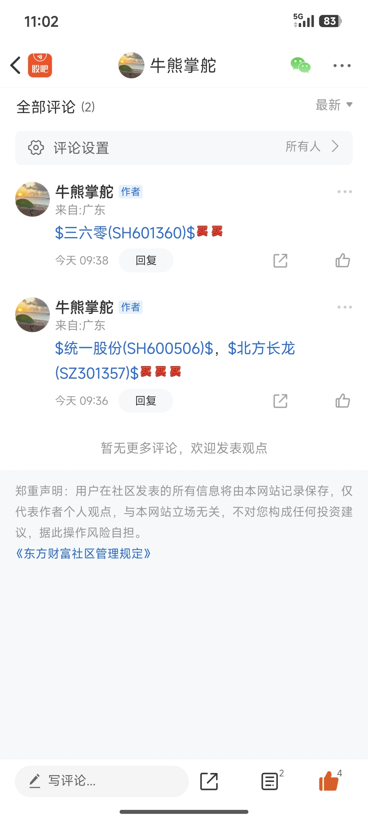 温馨提示: 1.根据《证券法》规定,禁止编造、传播虚假信息或者误导性信息,扰乱证券市场;2.用户在本社区发表的所有资料、言论等仅代表个人观点,与本网站立场无关,不对您构成任何投资建议。用户应基于自己的独立判断,自行决定证券投资并承担相应风险。《东方财富社区管理规定》
