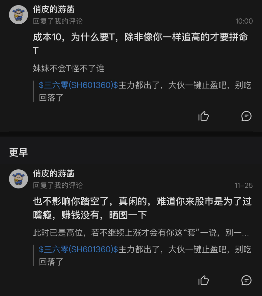 $三六零(SH601360)$ 昨天我预告各位先撤退,这妹妹昨天和今天还疯狂唱戏,眼看绿油油结果还要去怼每一个这两天看跌的。