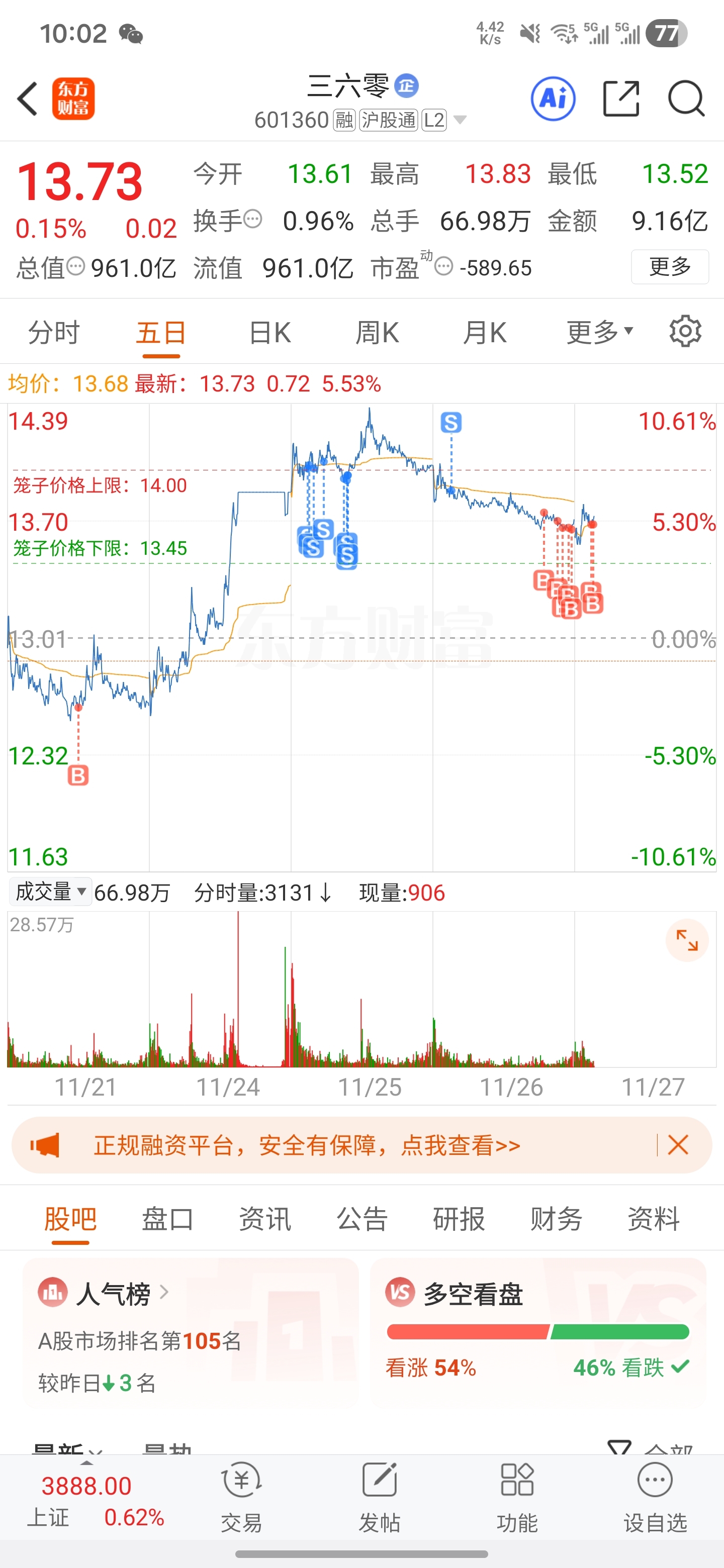 $三六零(SH601360)$ ——【继续增持13.680-13.80】
