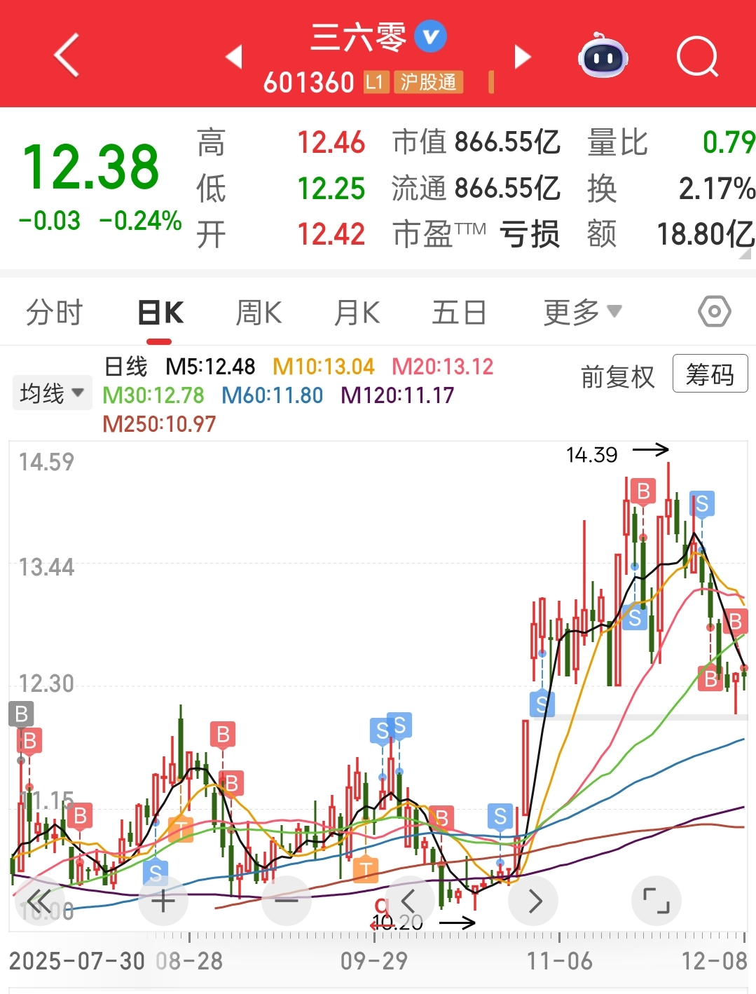$三六零(SH601360)$ 持股87天了,除了10月28号那天别的股必须要钱,所以在低位出了一点以外,总的来说做得都不错。成本越来越低,满意。