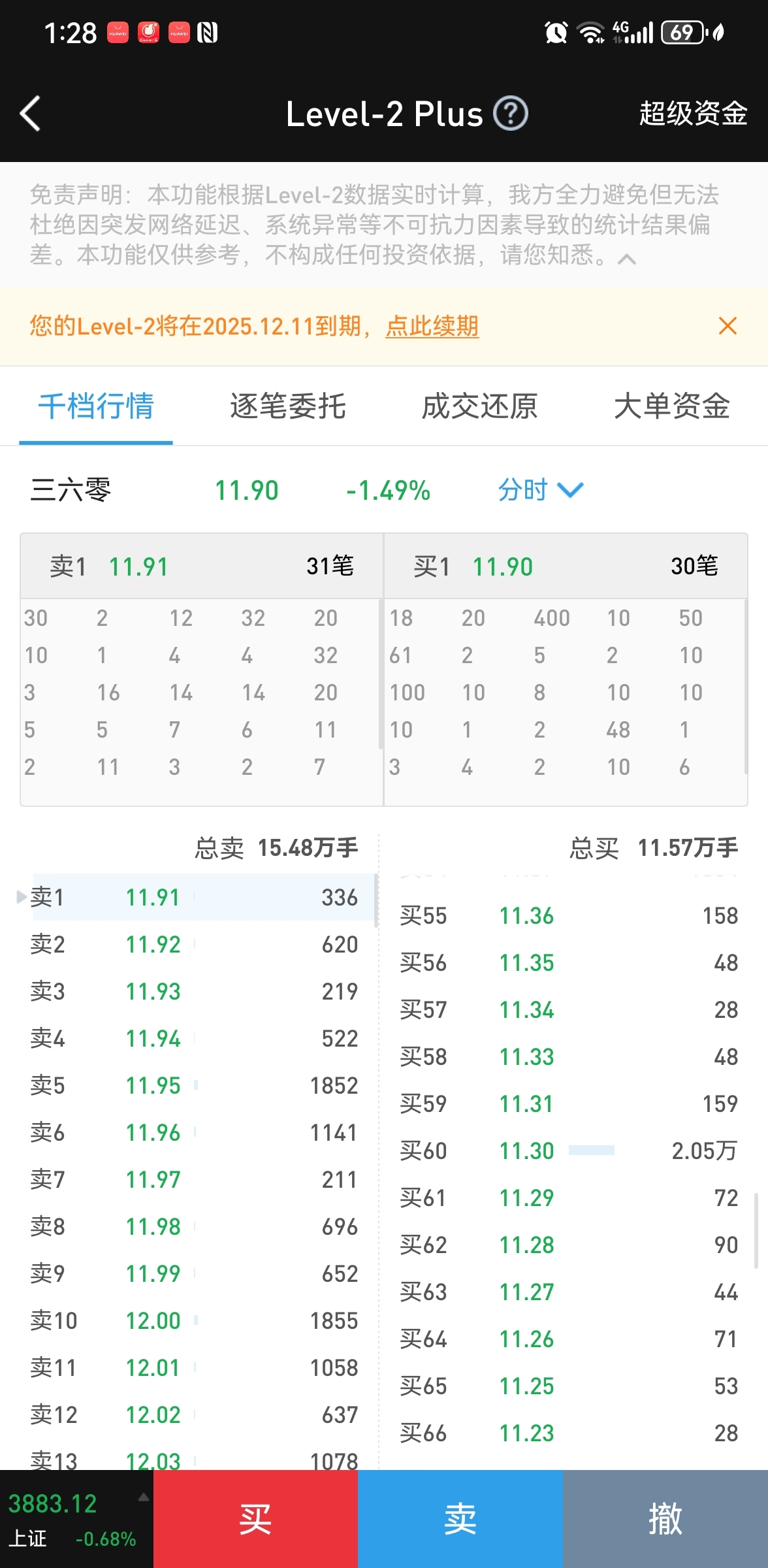 $三六零(SH601360)$ 11.30元,2.05万手托单。空仓观望