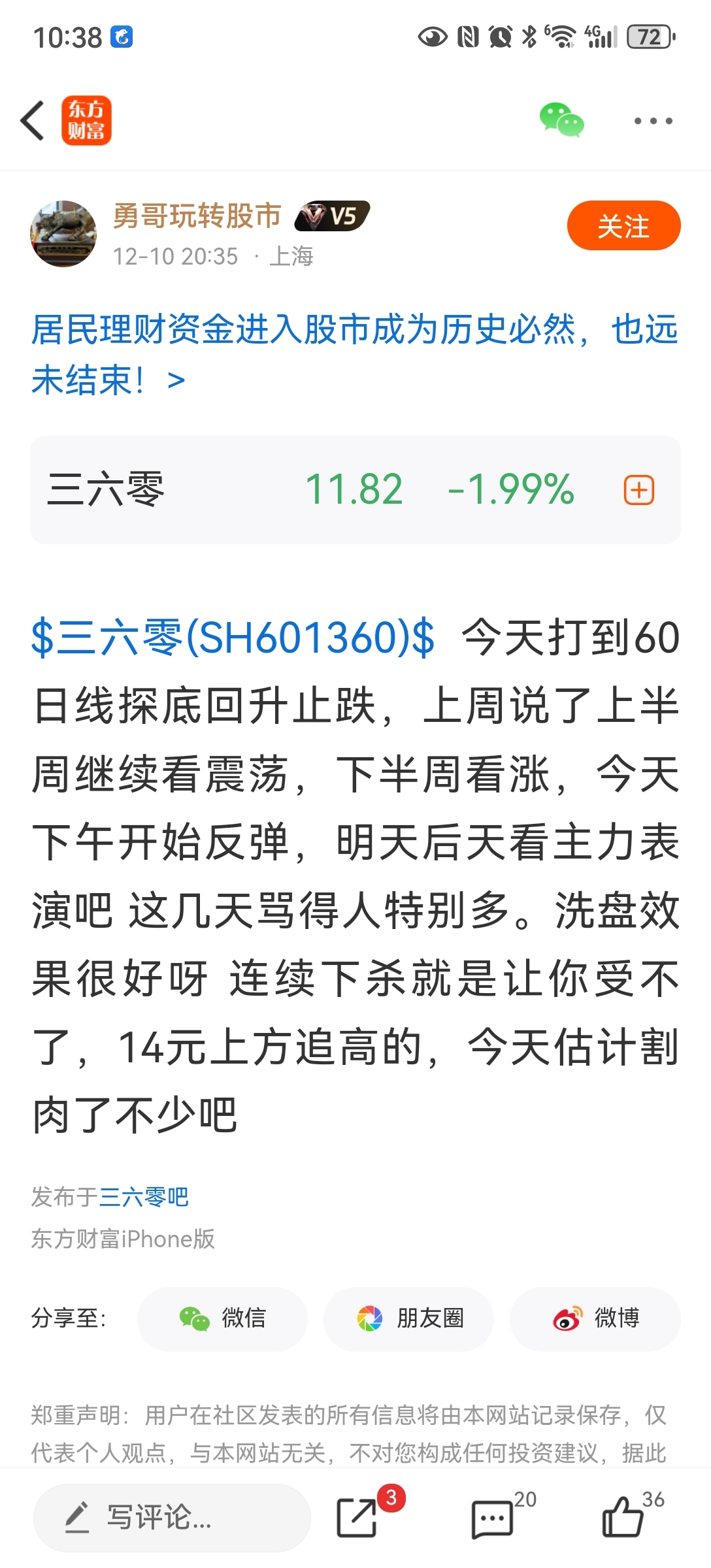 $三六零(SH601360)$ 勇勾托上个礼拜就在喊了,下半周会涨,每次都啪啪啪啪打脸,你是每天来表演被骟的吗!?