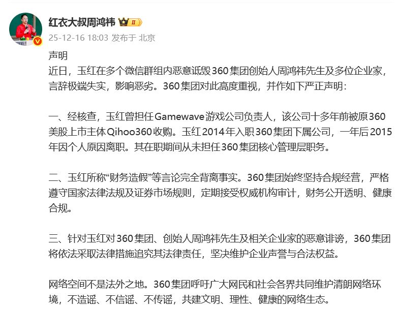 近日,玉红在多个微信群组内恶意诋毁360集团创始人周鸿祎先生及多位企业家,言辞极端失实,影响恶劣。360集团对此高度重视,并作如下严正声明: