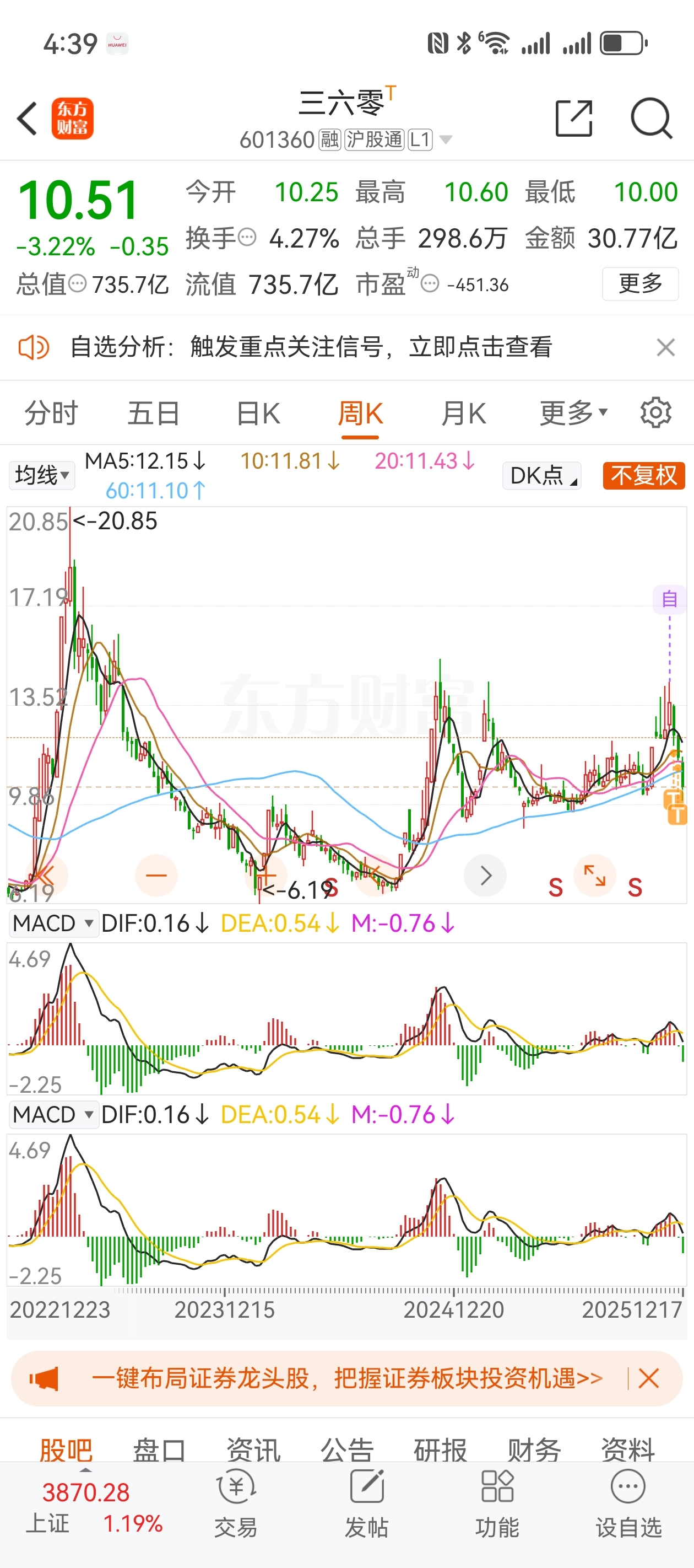 $三六零(SH601360)$ 周线在箱体底部,这个位置报财务造假,只有主力知道会怎么样,筹码在集中,日线跳空下跌线出现,难看的很,ETF重仓股,看这一次三年能不能回本,毕竟很多大票拉升前都会暴雷,红衣大叔,是惯犯,上一次是离婚案,