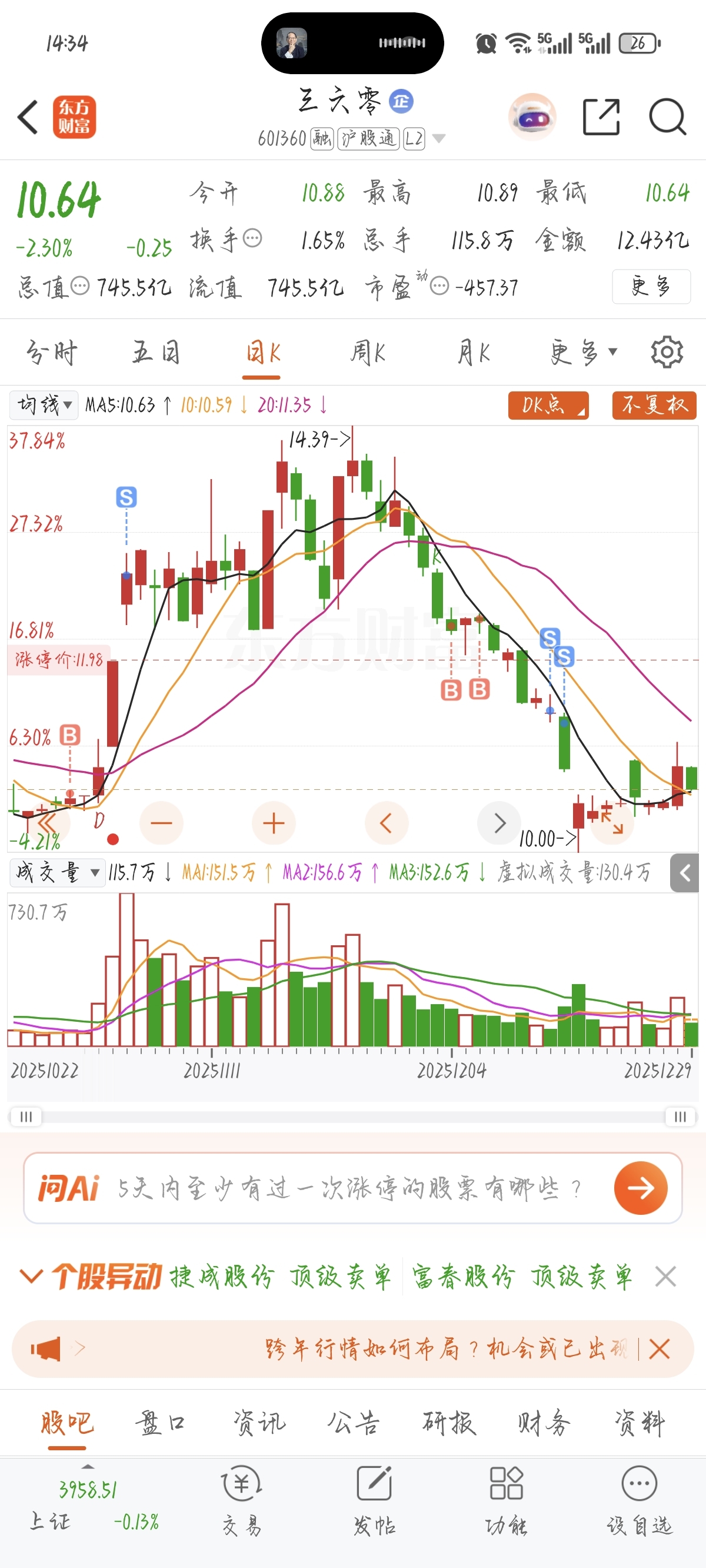 $三六零(SH601360)$ 还好当时跑得快,可我盯了这么久,昨天刚看到希望,今天又被砸了,主力不会突然偷袭吧?