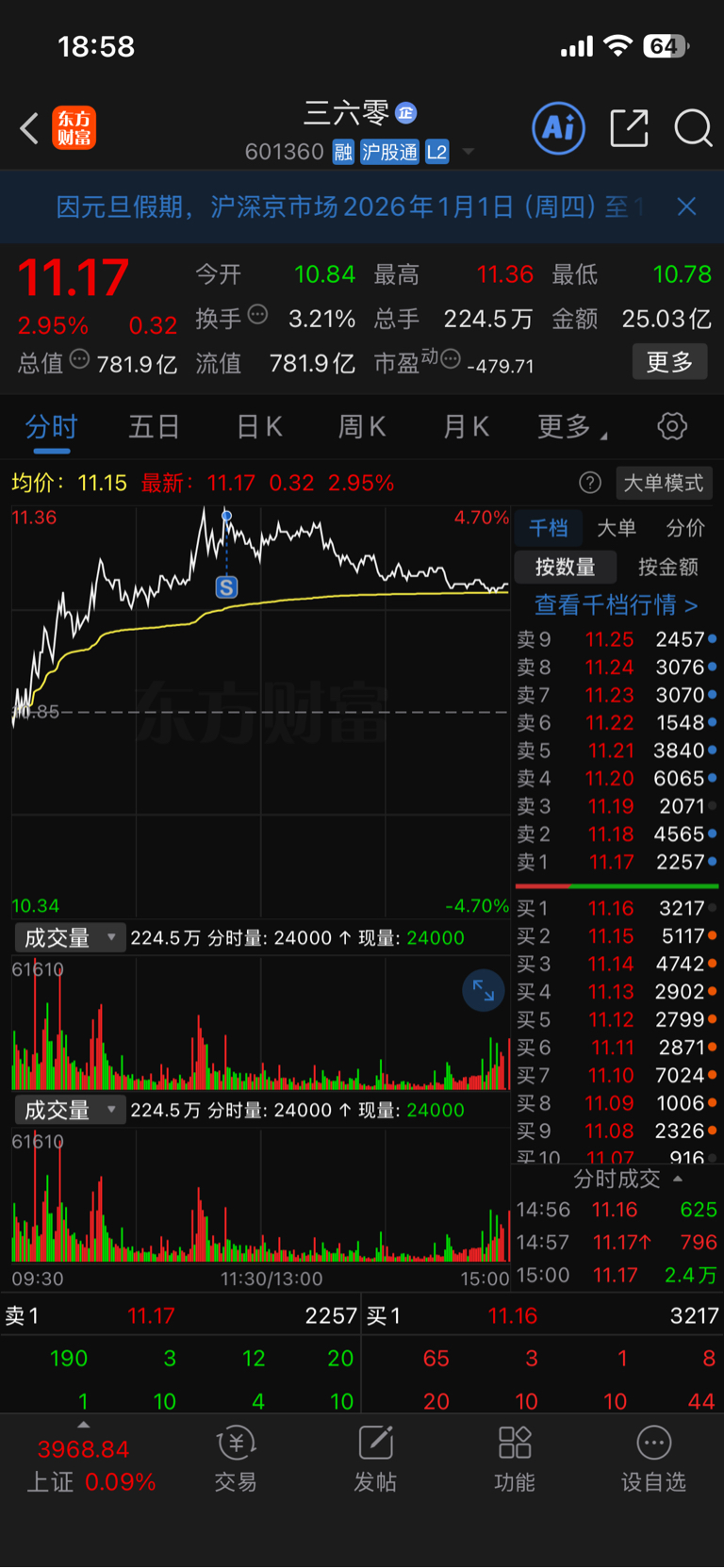 $三六零(SH601360)$ 好像卖早了,九阳神功第七天,节后应该会放量大涨,还有一半仓位,希望节后开门红。