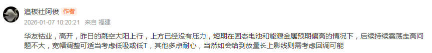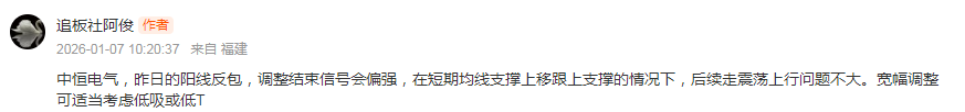 策略上,继续大幅冲高,则需注意前期高位卖压,需考虑进行高减或高T。宽幅调整可适当考虑低吸或低T。
