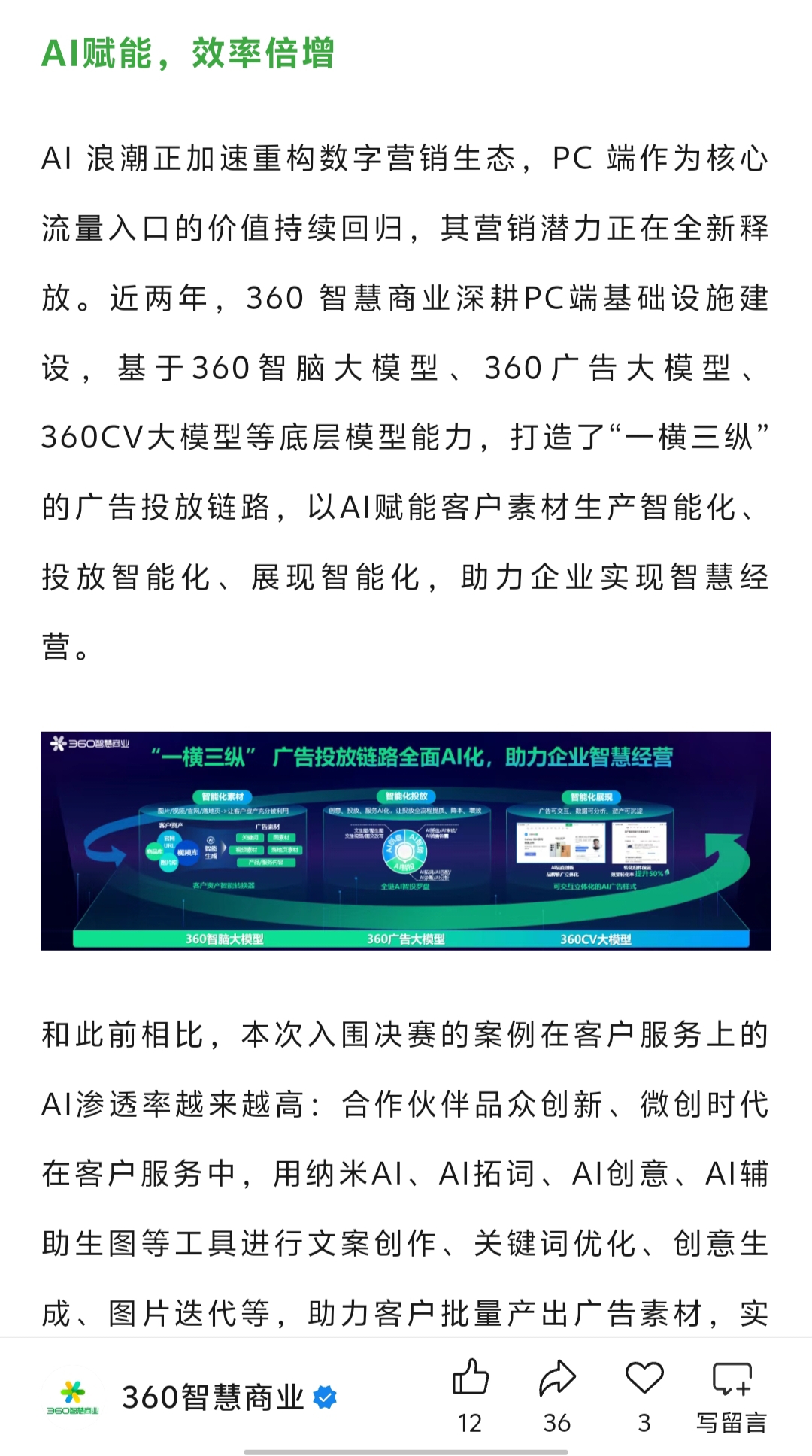 AI驱动生意全域增长:生成式AI带来的生产力革命推动,基于360智脑大模型、360广告大模型等底层模型能力,打造了“一横三纵”的广告链路,以AI赋能客户素材展现智能化,助力企业智慧经营。