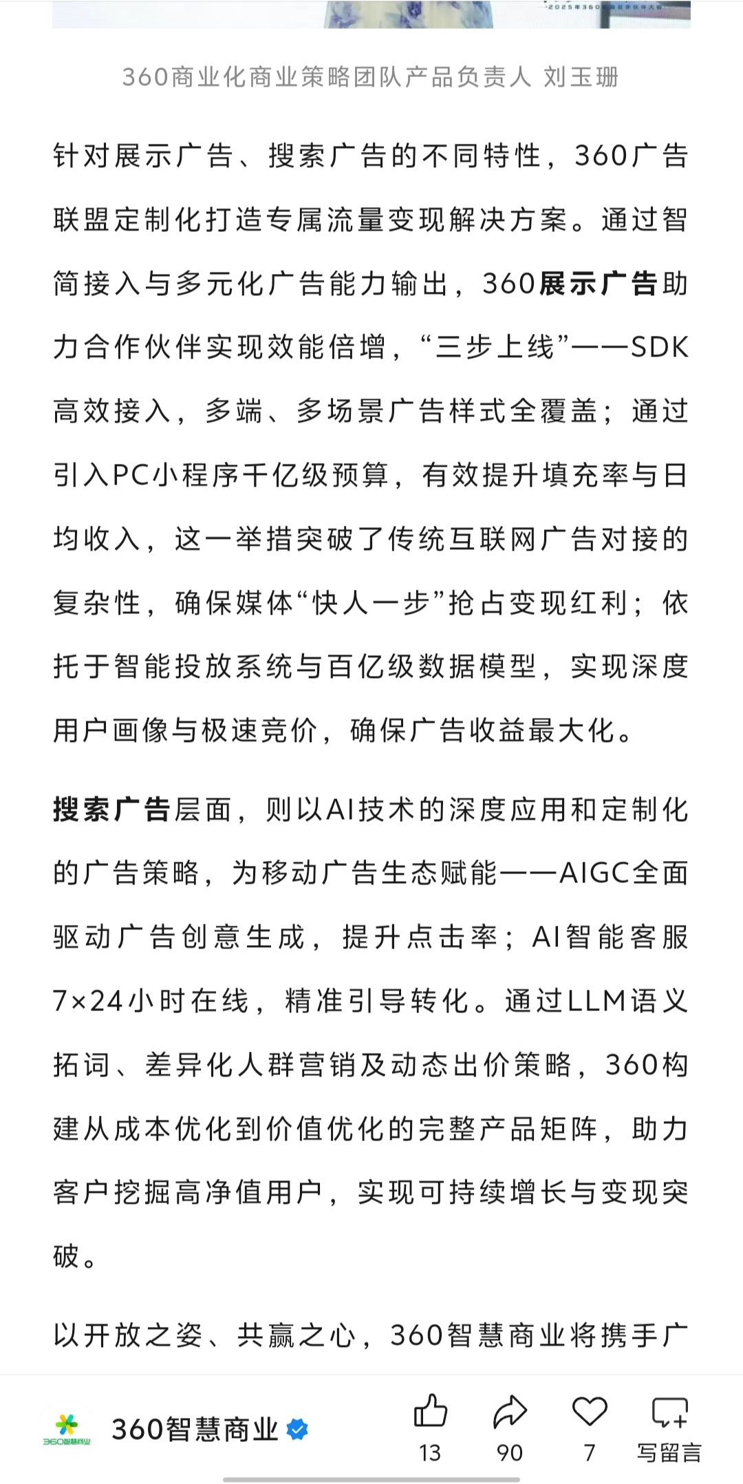 360智慧商业打造了生态广告(搜索 展示)。搜索广告层面,则以AI技术的深度应用和定制化的广告策略,为移动广告生态赋能——AIGC全面驱动广告创意生成,提升点击率。通过LLM语义拓词、差异化人群营销,助力客户挖掘高净值用户。
