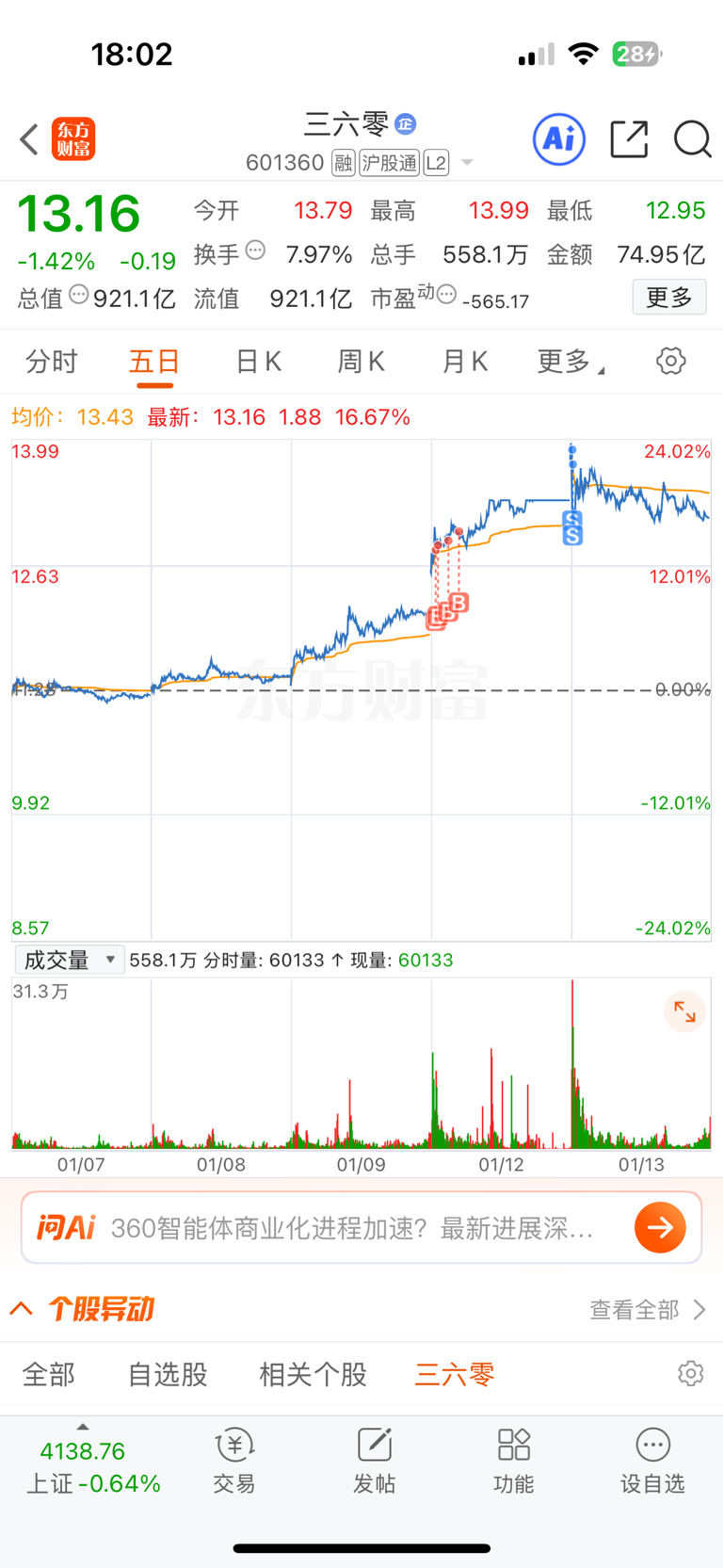 $三六零(SH601360)$ 有点后悔了,明天会反包