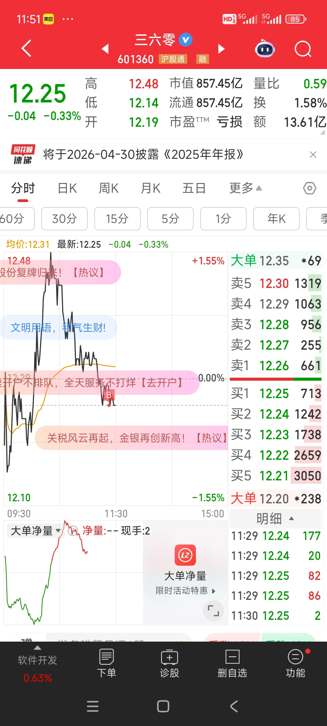 $三六零(SH601360)$ 感觉跌不下去了,买个5000股试试,明天来个涨停就抛。