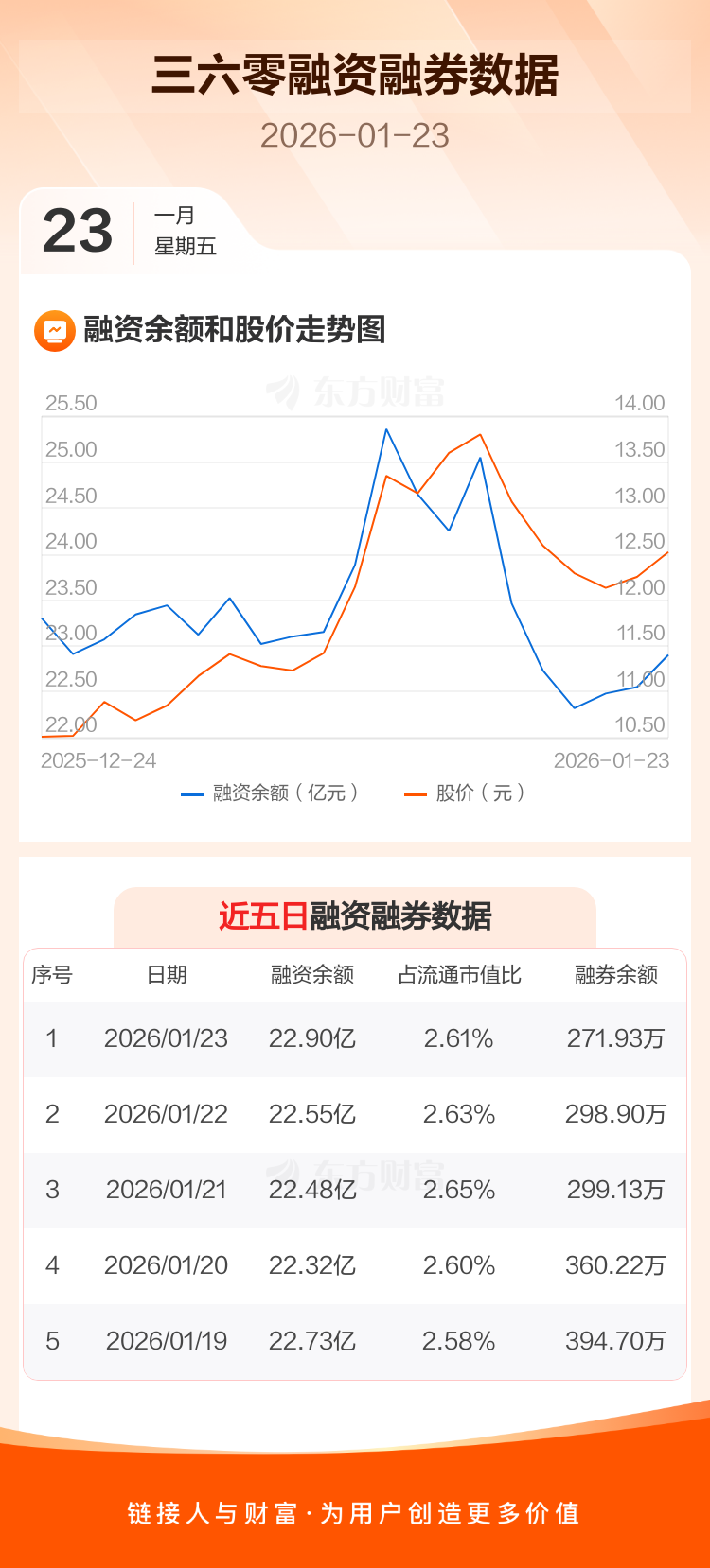 交易所最新数据显示,三六零于2026年1月23日获融资买入2.62亿元,融资偿还2.27亿元,当日融资净买入3455.5万元。目前,该股融资余额22.90亿,占流通市值比例为2.61%。