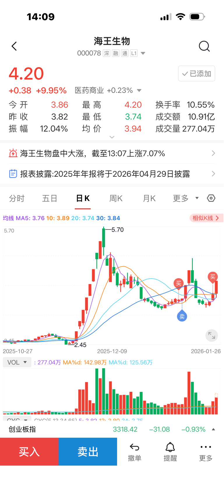 礼拜五买入海王,今天吃一个涨停,看你们意得凶,尾盘买了点烂股360!明天破12就