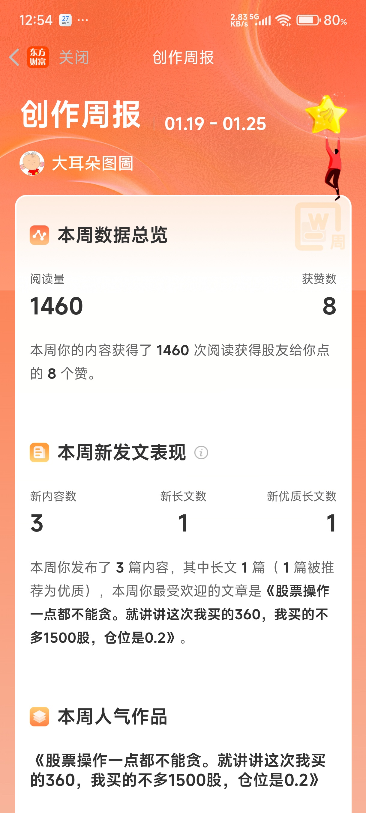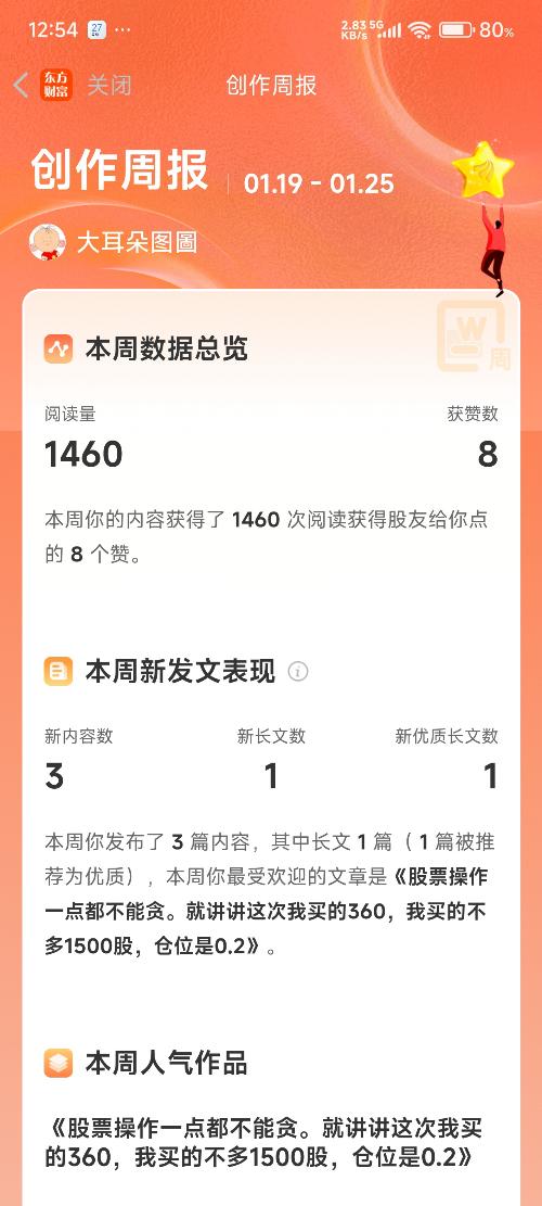 $三六零(SH601360)$ 股票操作一点都不能贪。就讲讲这次我买的360,我买的不多1500股,仓位是0.2成,价格是13块6,原来我好赚1500元,但我贪心了,又认为我仓位极轻而忽略了,其结果,现在反而让我深套亏损1500元,虽然这些不伤我大雅,但也留给我深刻的教训,股票获利要走,不要怕卖飞,卖飞可以寻找下一次机会,但是深套就是死路一条,而且还会搞坏你的心态,对下一次有机会的操作,你就会缩头缩脑,顾虑重重,胆子极小,这样就赚不到钱,这就是股票卖飞和深套的区别。